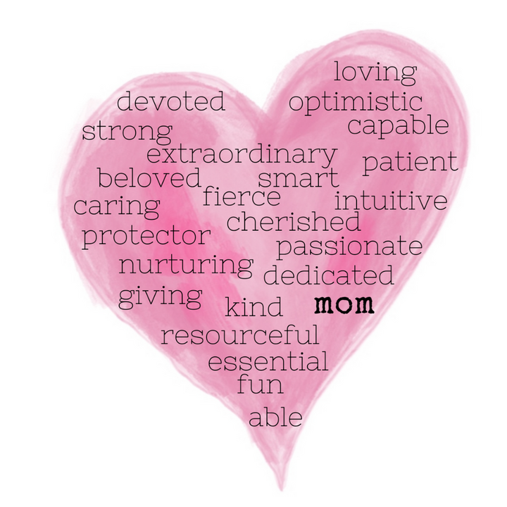 Our signature heart print filled with beautiful words to describe an amazing mom. The word "mom" is in bold, surrounded by descriptive and empowering words.
